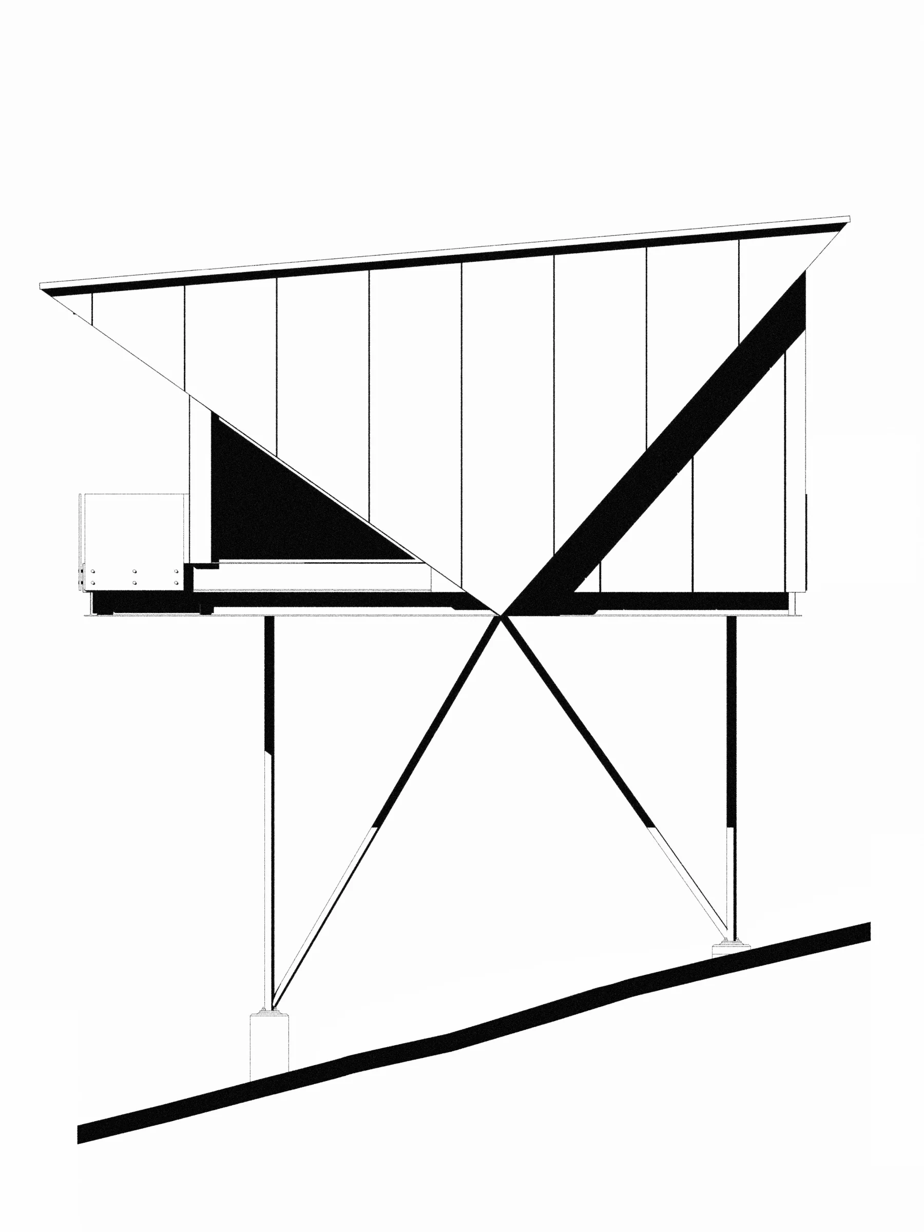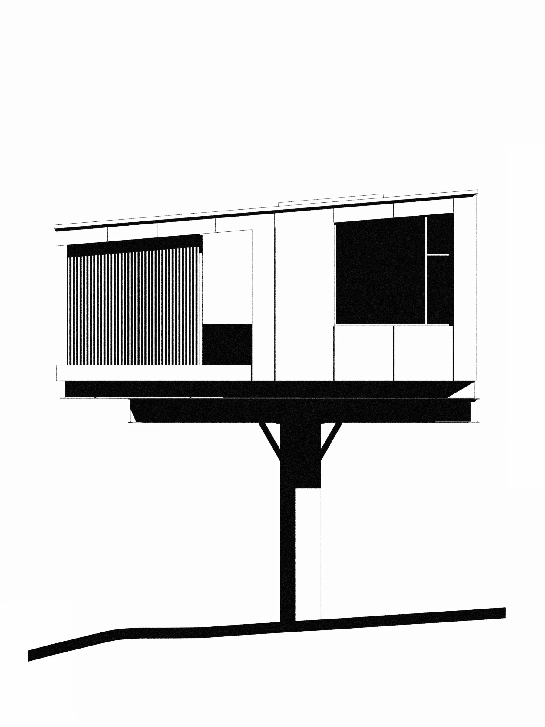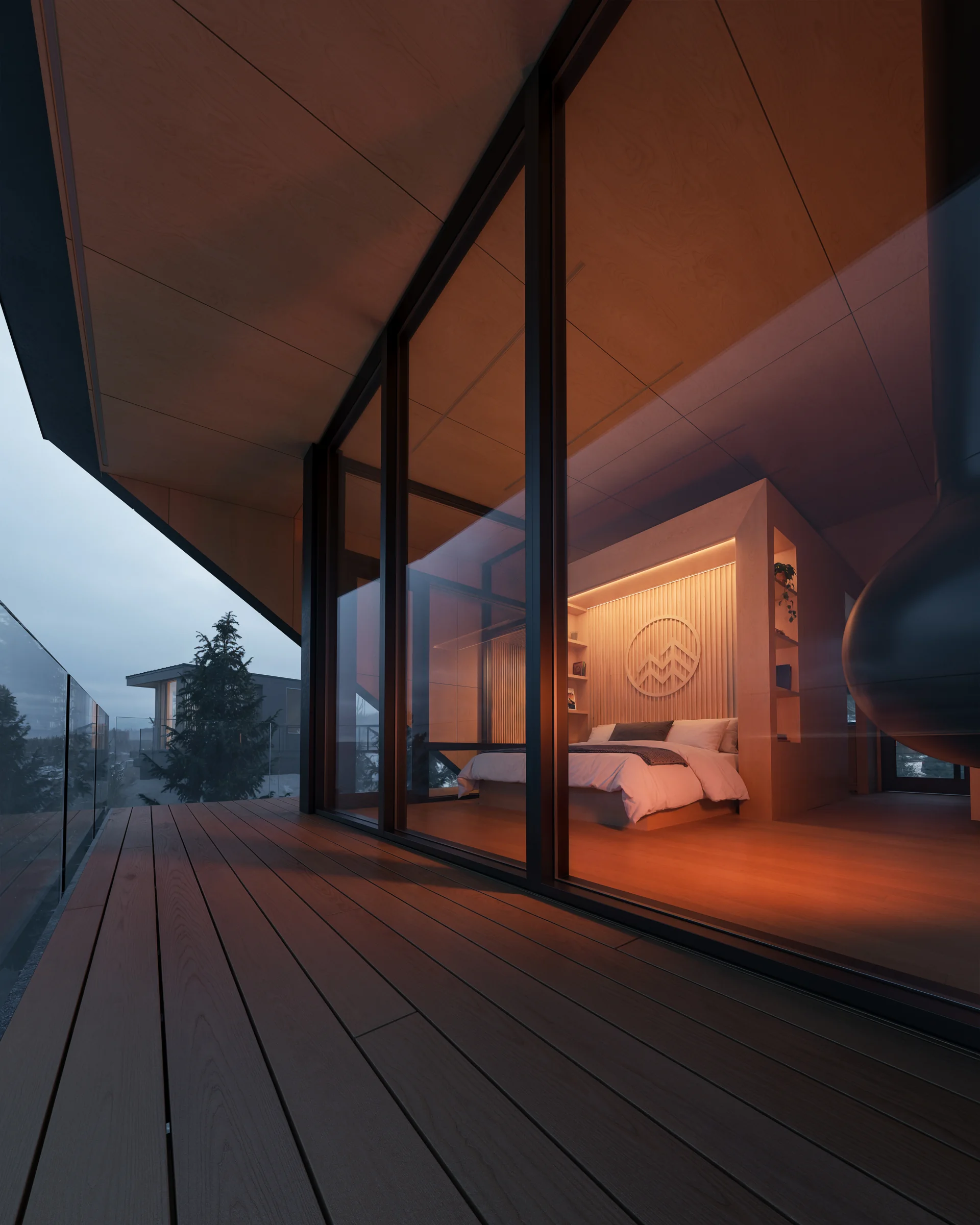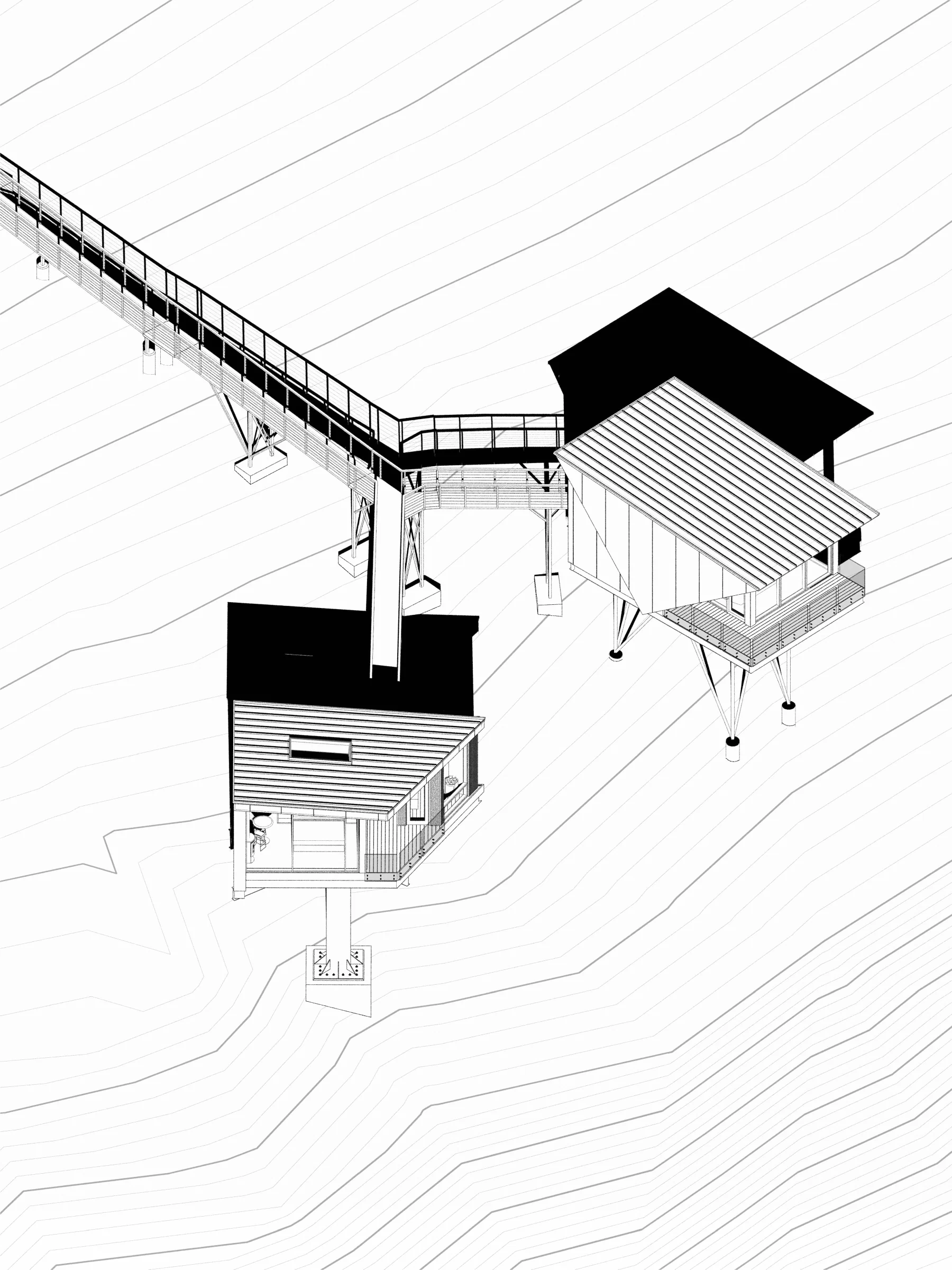 The two new cabins rise approximately twenty feet above the rocky ground, positioned carefully within the existing tree canopy. Rather than flattening or reshaping the terrain, the design works with it—lifting the structures lightly off the site to reduce disturbance and maintain natural drainage paths flowing toward Lake Superior. Elevation serves multiple purposes. It minimizes site impact, protects against heavy snow accumulation and shifting ground conditions, and places guests within the forest rather than on top of it. From this vantage point, occupants experience the lake’s shifting moods—calm summer mornings, rolling fog, and winter storms—while remaining sheltered and secure.
